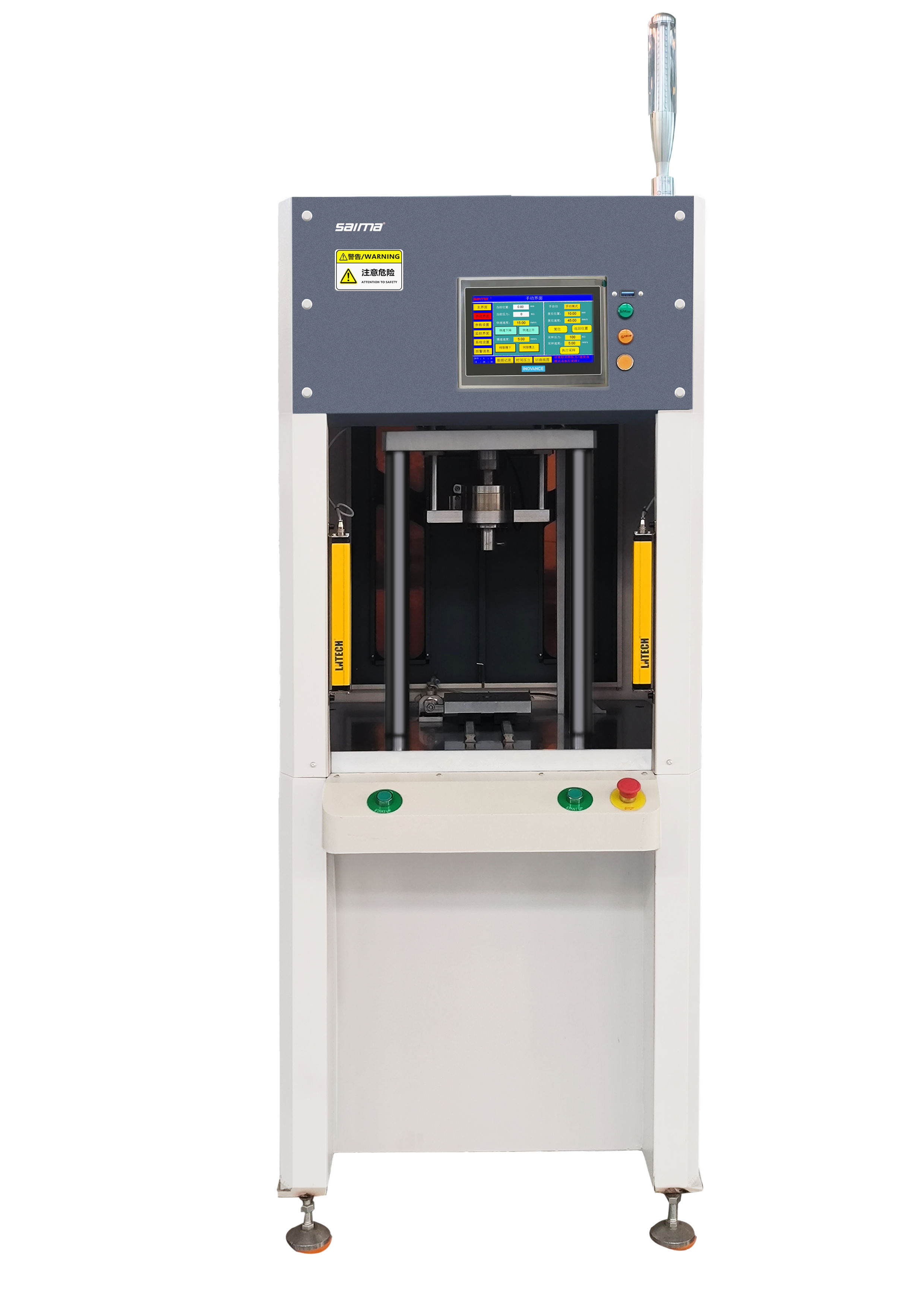 (3)在人機(jī)顯示屏運(yùn)行接口選擇需要壓裝的模具號(hào);在選擇按鈕切換為“自動(dòng)/單循環(huán)”模式,然后雙手同時(shí)按下按鈕盒上的啟動(dòng)按鈕,設(shè)備開始運(yùn)行;三色燈為黃色運(yùn)行指示。