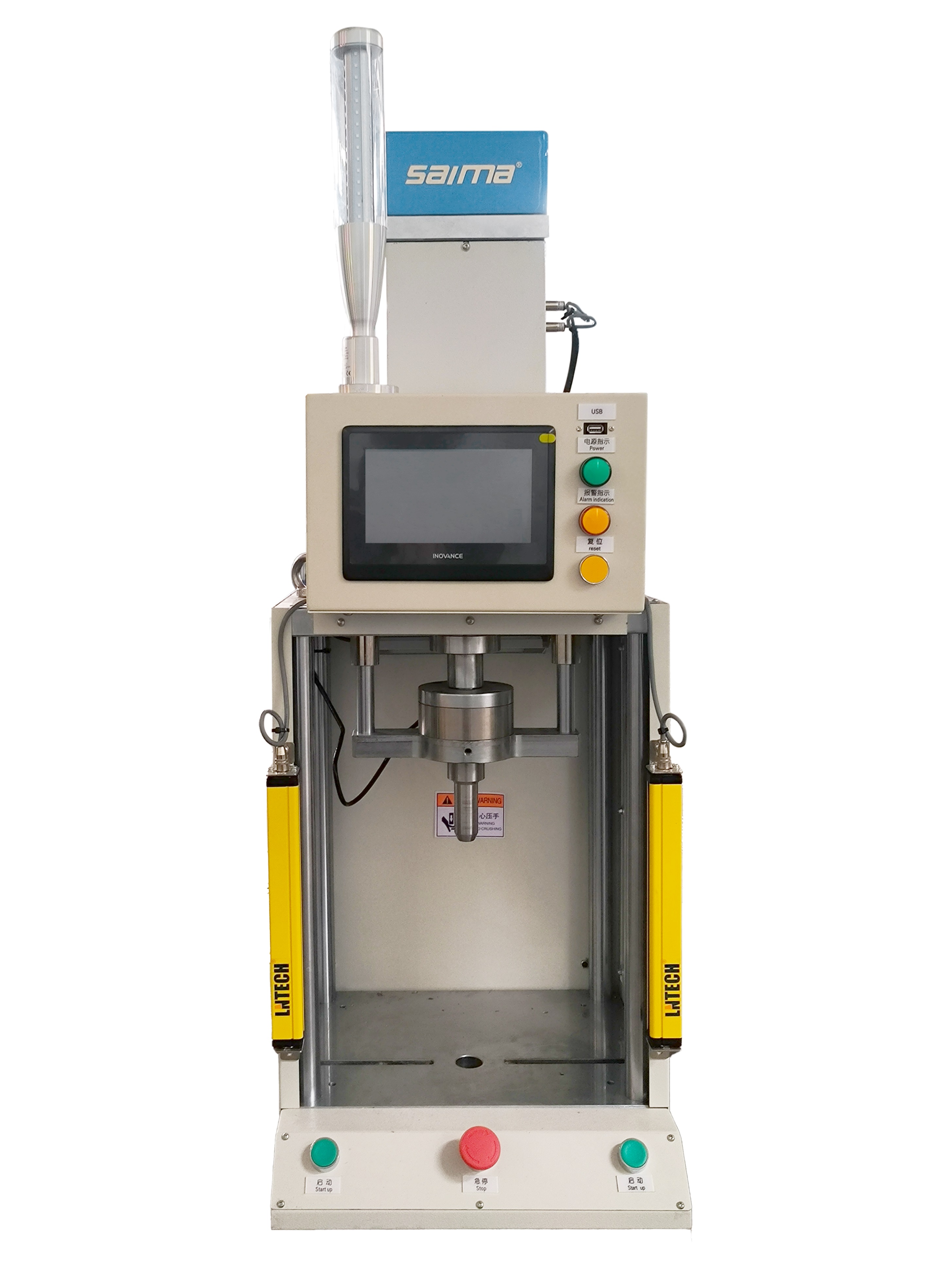 4 :壓裝力與位移全過(guò)程曲線(xiàn)圖顯示在伺服壓力機(jī)液晶顯示觸摸屏上;全過(guò)程控制可以在作業(yè)進(jìn)行中的任意階段自動(dòng)判定產(chǎn)品是否合格, 100%實(shí)時(shí)去除不良品,從而實(shí)現(xiàn)在線(xiàn)管理。